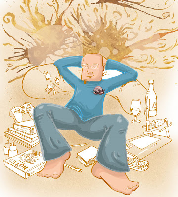 La pose de ce dessin est d'inspiration honteuse et goulûment ventousé sur un dessin du Sieur Boulet, mais il m'évoquait à la perfection cet état de plénitude béate nimbée de langoureux désoeuvrement qui sied à ravir au candide que je suis, repus d'une année bien grasse gorgée de réflexions adipeuses d'ados composés à 80 % de sébum, cernée par des responsabilités indigestes plus ou moins éthylo-pédagogiques ( comme faut il mieux boire avant ou après les 2nde BEP clef de 12 et testostérone ?? ), et comme on repousse négligemment la cerise confite superflue sur le grand banana split de la vie, esquiver, tant que faire ce peut, toute forme de hiérarchie administrative et ses regards lourds de reproches, brefs tout ce qui porte des mocassins à glands.